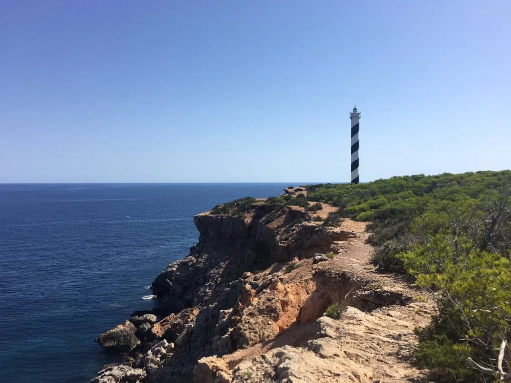 From the beach of Portixol in Portinatx, north of Ibiza, follow the path to the right that runs along the coast without taking any of the detours into the interior and you will reach the Moscaster Lighthouse, better known as Portinatx Lighthouse. It is a simple and flat walk with which you will enjoy beautiful views of the sea and the islets of Ses Formigues.
