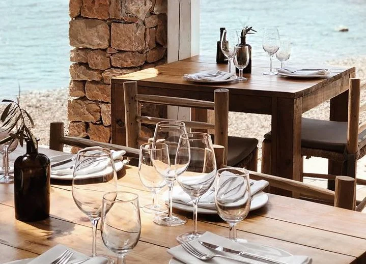 The surrounding rustic boathouses and rock formations offer the perfect amount of privacy, while you still have the option of food and drinks at Cala Bonita. Now, we shouldn’t really be telling you about this, it’s one of the islands hidden gems where you can spend a relaxed lunch in the raw, open air natural environment. Looking out to the iridescent sea, you can eat a delicious meal amongst the sun dapples trellis.