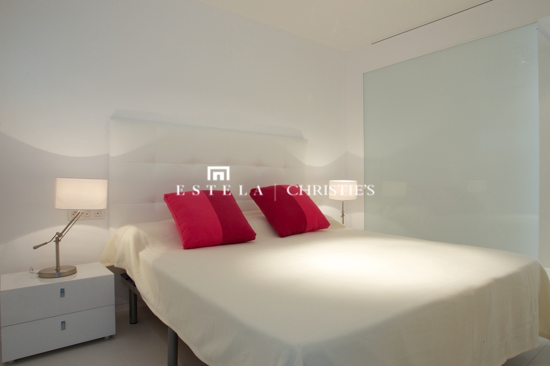 Appartement a Patio Blanco a Marina Botafoch, Ibiza. Inspiration méditerranéenne et travail de vie de «Life Marina Ibiza», du célèbre architecte Jean Nouvel. Il est situé au coeur de Marina Ibiza. Le bâtiment ressemble à un théâtre italien et sa façade avant est recouverte de verdure et de fleurs colorées. Le bâtiment Patio Blanco s'inspire du style de vie d'un patio andalou traditionnel. L'extérieur a des similitudes avec les maisons typiques d'Ibiza, telles que les murs blancs avec de petites fenêtres. La botanique est essentielle pour la conception de ce bâtiment. Un de ses murs est un jardin vertical géant avec bougainvilliers et jasmin. La nuit, le patio et sa piscine intégrée sont magnifiquement éclairés. Il dispose également d'une terrasse commune sur le toit avec des chaises longues, des douches et une superbe vue . Du garage souterrain confortable, vous avez un accès direct par ascenseur à l'appartement, à la piscine et au toit. Le bâtiment a été récemment rénové. Cet appartement a 73,8 m², avec 2 chambres et 2 salles de bain, un salon ouvert avec une cuisine moderne entièrement équipée et une terrasse de 7 m².s