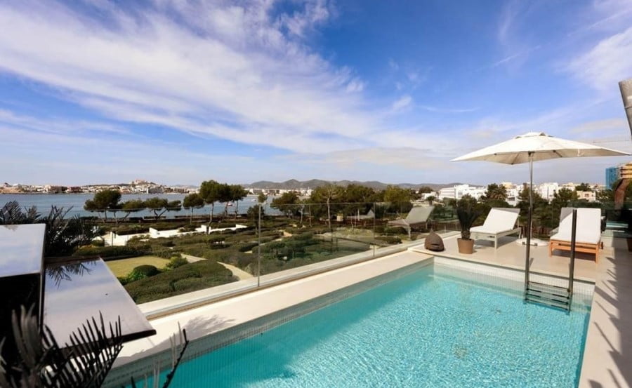New development of luxury apartments for sale in Talamanca, Ibiza. Es Pouet 2 is located a few steps away from the cosmopolitan lifestyle of Ibiza and located in an exceptional location in the Bay of Talamanca. This project represents a construction of quality and attention to detail, combining comfort and privacy in these distinguished homes. Enjoy a fully equipped recreation area with gym, spa and indoor pool. Enjoy the Mediterranean sun in the two outdoor pools, or simply relax on the different terraces. The ground floor apartments and penthouses enjoy private pools. Apartments of 3 and 4 bedrooms.