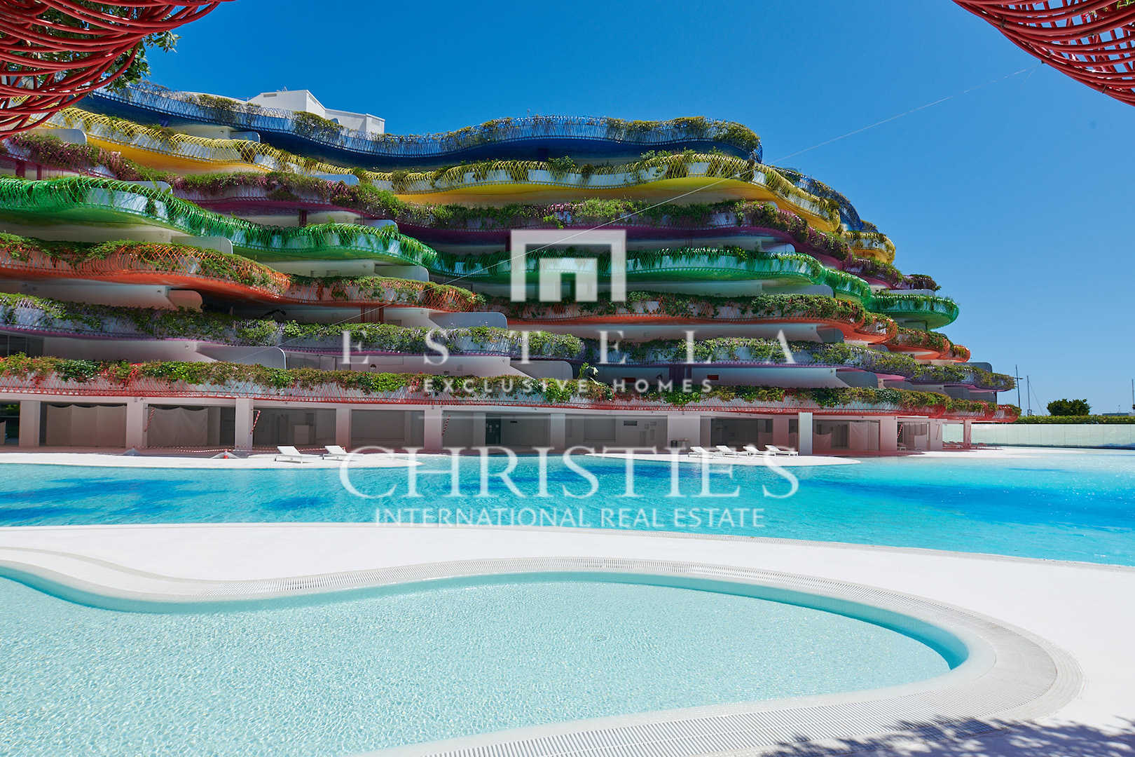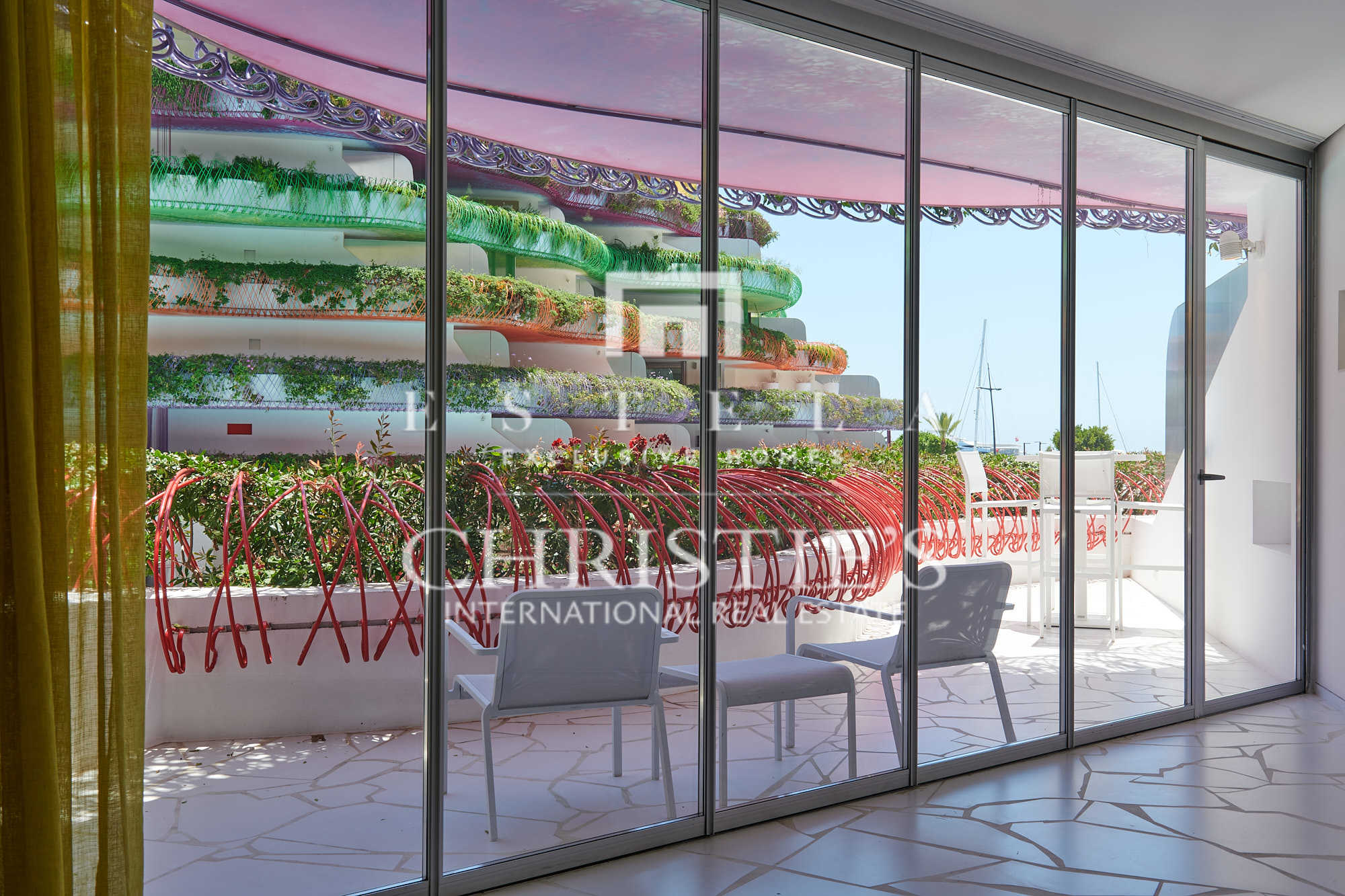 Appartamento all'interno dell'edificio Las Boas, Marina Botafoch, Ibiza. Progettato dall'architetto Jean Nouvel, Las Boas offre un'esperienza unica con una vista panoramica sulla città vecchia di Ibiza, Formentera e il mare. Gli appartamenti di lusso sono progettati in maniera unica. L'edificio dispone di balconi di diversi colori ed è ciò che lo rende così originale. Vi sono dei bellissimi giardini che circondano l'edificio con una piscina a forma di lago. Vi è inoltre garage, due saune e una palestra. Tutti gli appartamenti dispongono di aria condizionata; sicurezza 24 ore al giorno e tutta l'area è video sorvegliata. Il prezzo dell'appartamento include un I-Pad che controlla la domotica, consta di 114 m², dispone di 2 camere da letto, 2 bagni, una cucina a vista sul soggiorno che da su un'ampia terrazza.