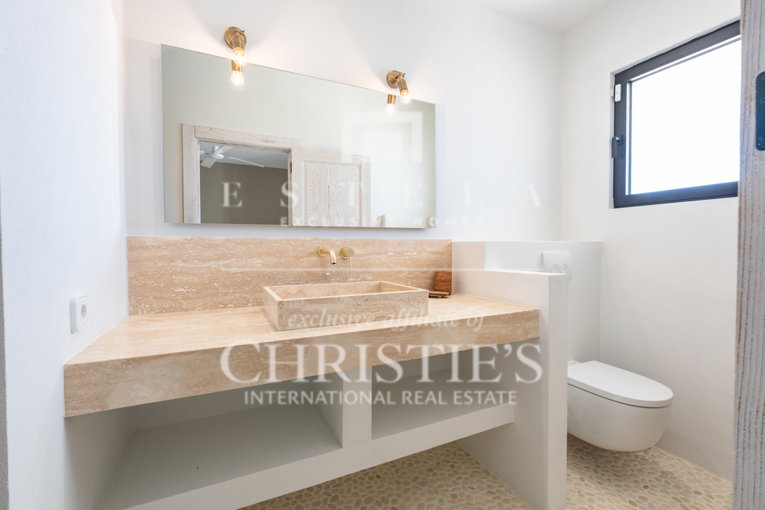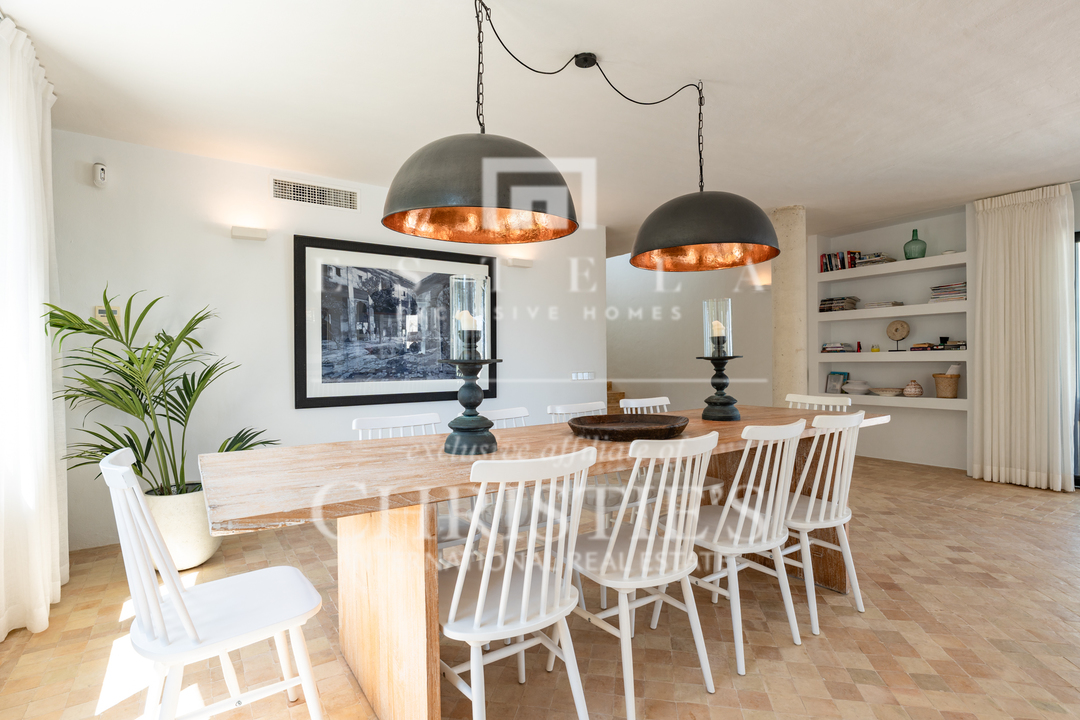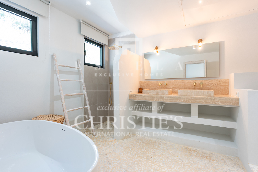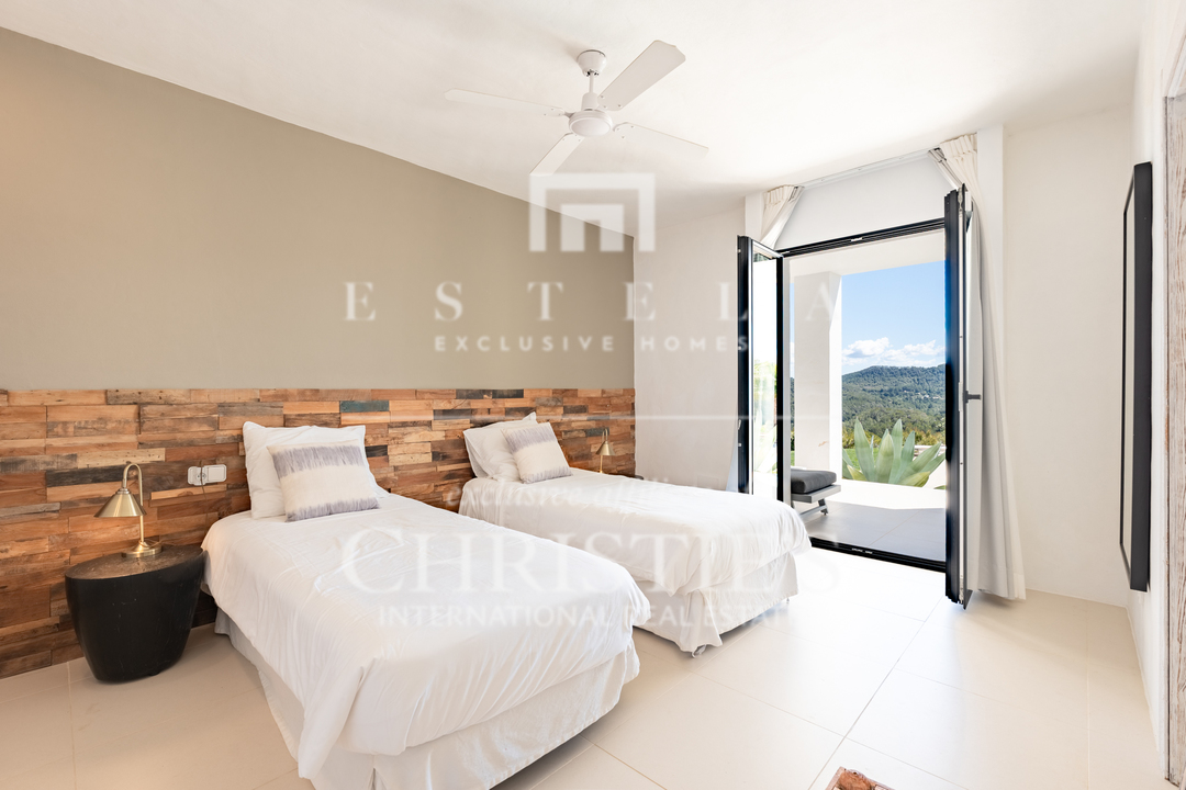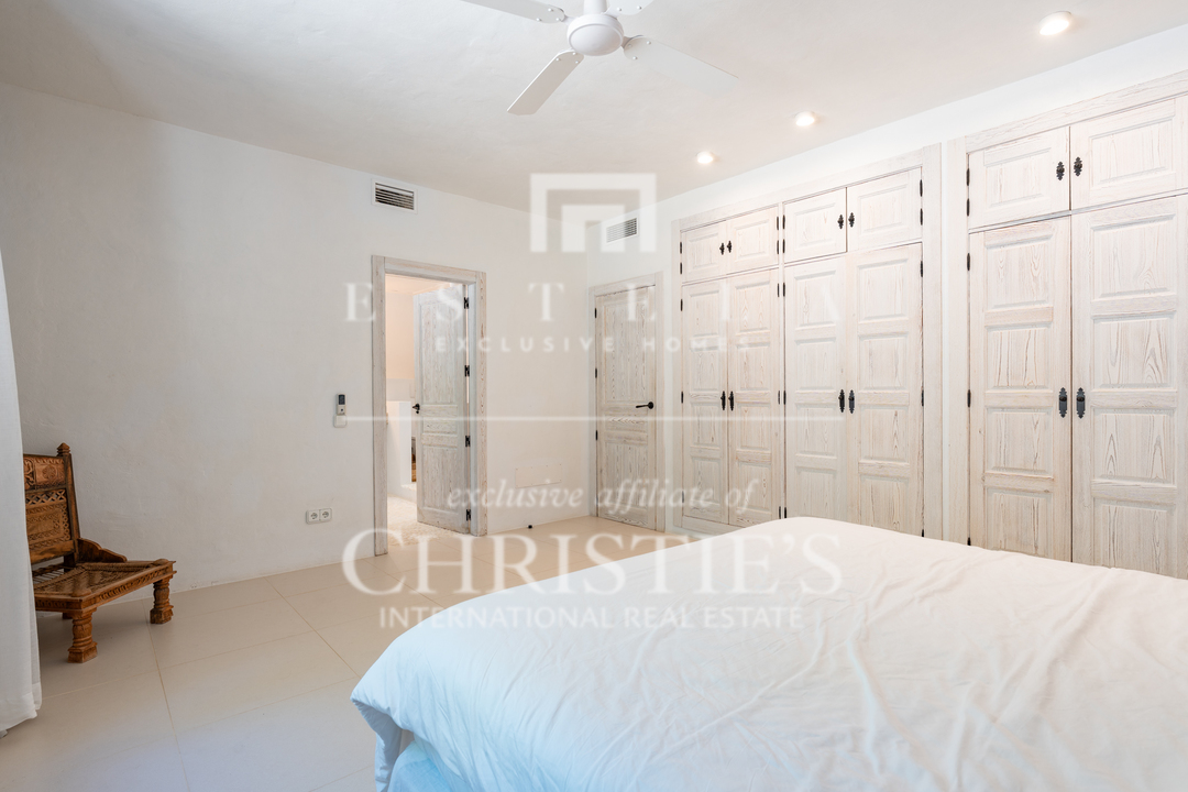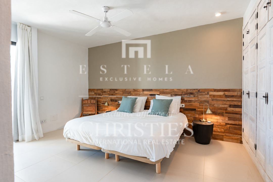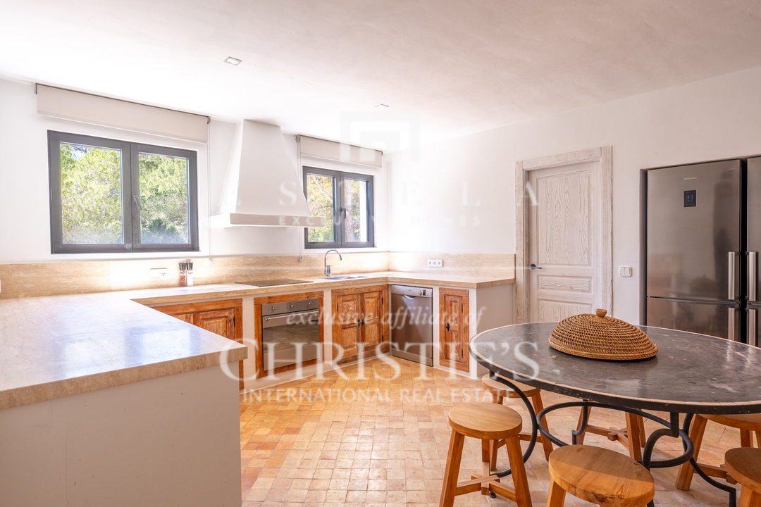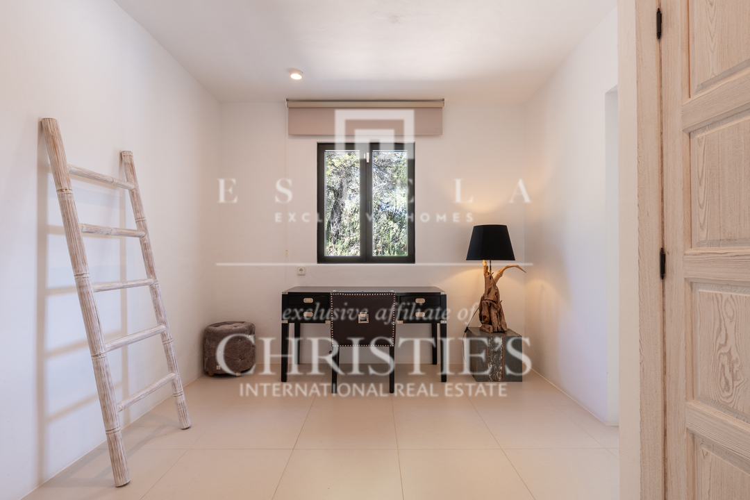 Appena entrati in questa villa riprogettata vicino a Sant Josep, sentirete subito la miscela di eleganza moderna e tranquillità mediterranea. La vista sulle montagne, il giardino lussureggiante e le ampie aree interne ed esterne vi faranno sentire subito a casa. Il luminoso soggiorno, completo di un accogliente caminetto, confluisce senza soluzione di continuità nell'ampia terrazza. Qui potrete preparare i pasti nella cucina esterna e finirli sul barbecue mentre il sole al tramonto dipinge il cielo di sfumature arancioni. Questa villa è stata progettata con cura per vivere senza fatica. Con quattro camere da letto nella casa principale, ognuna con il proprio bagno privato, ognuno ha il proprio rifugio privato. L'appartamento indipendente per gli ospiti dispone di altre due camere da letto, anch'esse con bagno privato e ingresso indipendente. Questo appartamento offre infinite possibilità, dall'ospitare amici e familiari alla creazione di un ufficio in casa o di uno studio di yoga. All'esterno, la generosa piscina di 15 x 5 metri attende di essere utilizzata per una nuotata rinfrescante o per un pomeriggio di relax, circondati dal suono delle cicale e da una leggera brezza marina. La terrazza sul tetto è la sorpresa finale: offre una vista panoramica che si estende fino alle colline e, di notte, si può godere dello scintillante cielo stellato. Il garage offre spazio per almeno tre auto e l'ampio terreno di 10.000 metri quadrati offre un potenziale illimitato. Create un giardino fiorito, coltivate la vostra frutta o lasciate che i bambini giochino liberamente sul vasto terreno. Sarete a pochi minuti da Sant Josep, con i suoi incantevoli ristoranti e negozi,