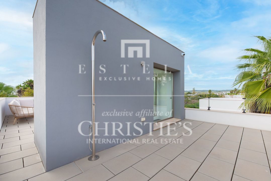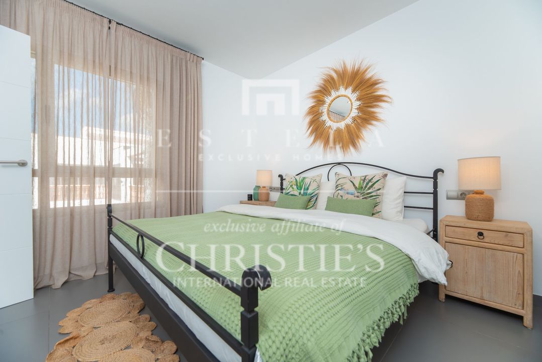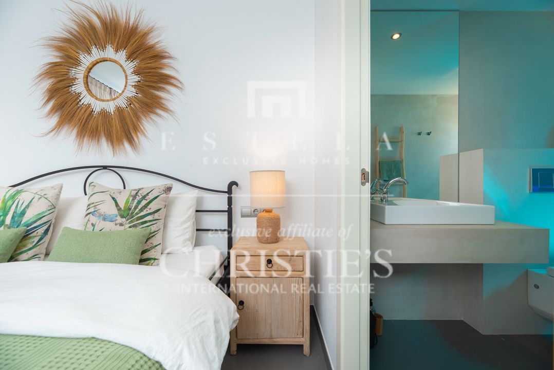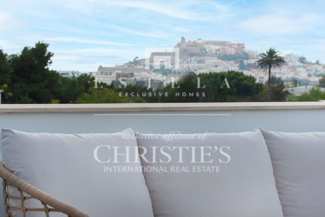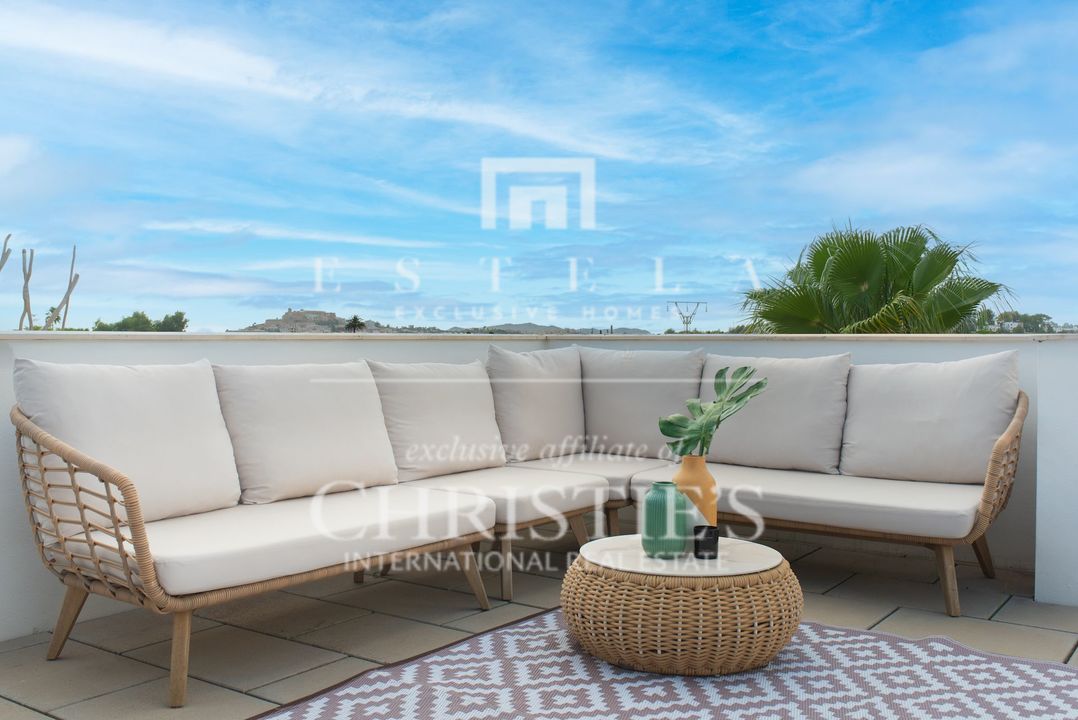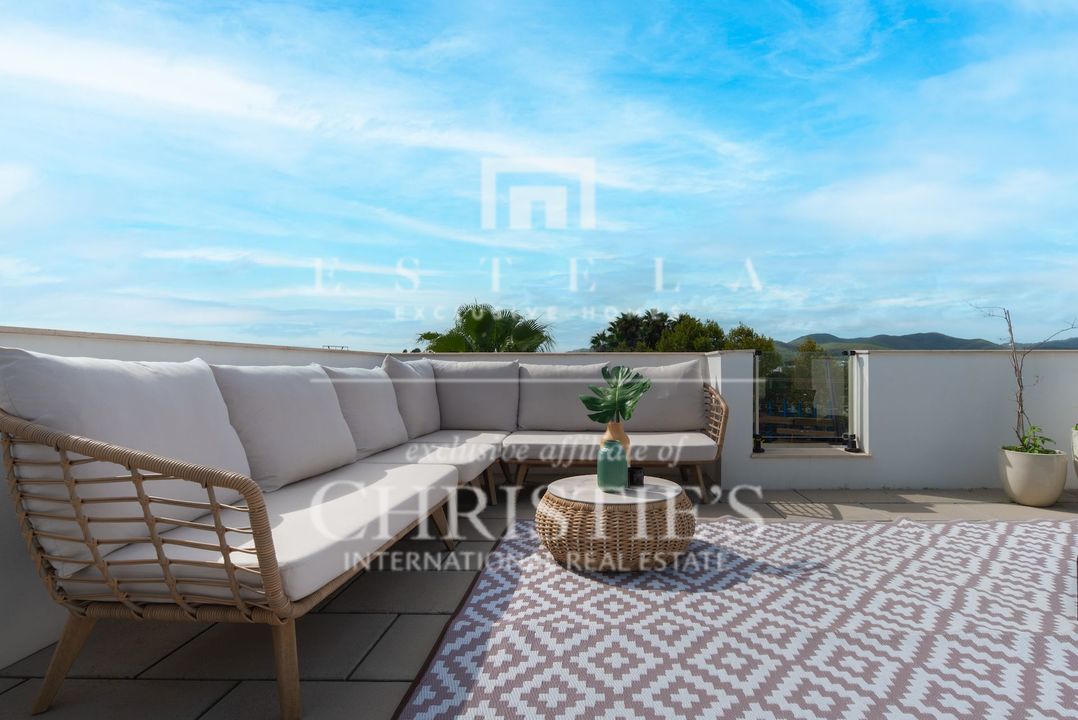 Located in the charming village of Jesús, this modern townhouse offers the perfect balance between tranquility and accessibility. Jesús is a vibrant and popular residential area with amenities open all year round, making it ideal for those seeking a permanent home or long-term stay in Ibiza. Within just a few minutes you can reach Ibiza Town, the exclusive Marina Botafoch and the beloved beaches of Talamanca and S’Estanyol. The village itself exudes Mediterranean charm with cosy restaurants, stylish cafés and boutique shops all within walking distance. Here you can enjoy a relaxed living environment while the energy and charm of the island are always close by. This 178 m² townhouse with 120 m² of outdoor space is designed for comfortable and atmospheric living. On the ground floor, you are welcomed by a bright open-plan living area with warm materials and large sliding doors that beautifully connect indoor and outdoor living. The adjoining dining area and fully equipped kitchen create an inviting space for relaxed meals and social gatherings. Completing this level is a separate guest toilet and direct access to the private garage, ideal for parking and extra storage. On the first floor, you will find three comfortable bedrooms. The master bedroom features an ensuite bathroom and a spacious, serene atmosphere thanks to large windows. The second bedroom has its own balcony, perfect for enjoying the morning sun and peaceful surroundings. The third bedroom is versatile and can serve as a guest room, children’s room or home office. These two bedrooms share a bathroom. All rooms are bright and inviting, with practical layouts that offer flexibility for your personal living needs. The outdoor area surrounding the private pool is designed for relaxation and summer enjoyment. Here you can enjoy sunny days on the loungers, dine outdoors or host cosy evenings with friends and family by the barbecue. The highlight of this property is the spacious rooftop terrace. From here you can enjoy panoramic views over the surroundings and the iconic silhouette of Dalt Vila in the distance – a magical setting for breathtaking sunsets. The rooftop terrace also features an outdoor shower, perfect for cooling off on warm summer days or after a morning yoga session under the blue sky. This townhouse in Jesús offers a relaxed, move-in-ready living experience where indoor and outdoor life blend harmoniously. An ideal home for those seeking comfort, atmosphere and the ultimate Ibiza lifestyle all year round.